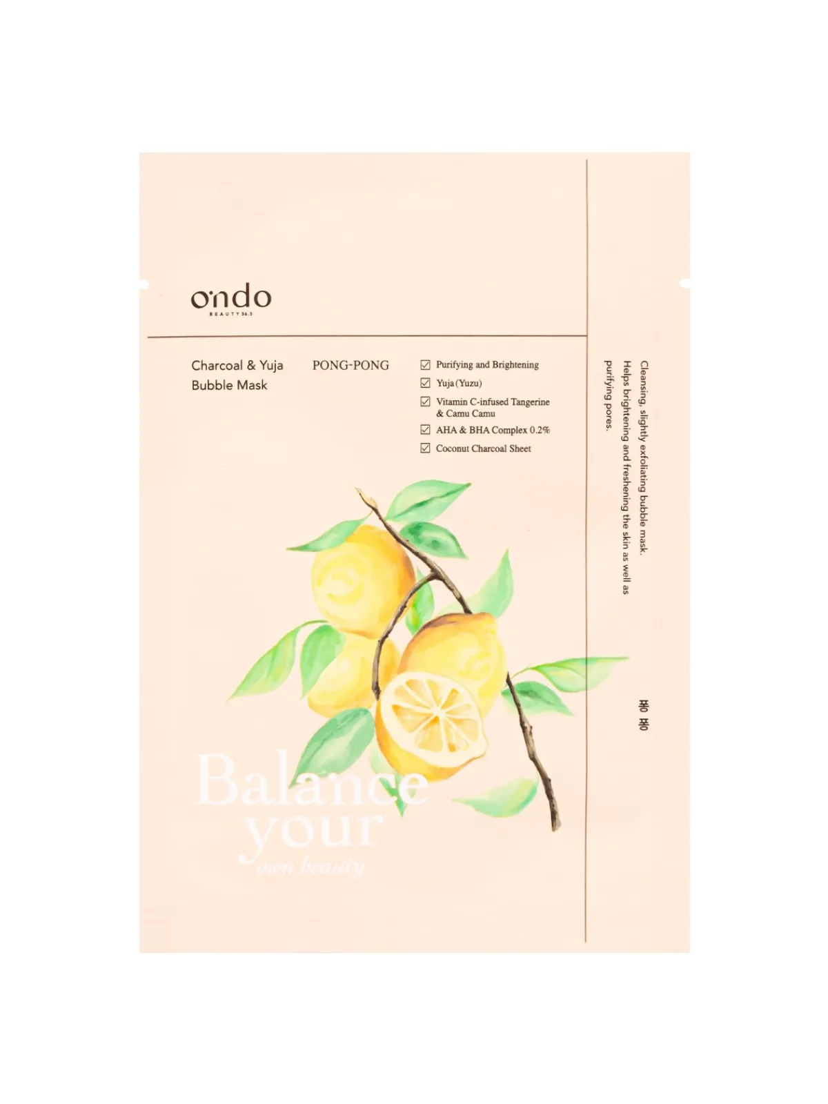 Se trata de una mascarilla limpiadora y ligeramente exfoliante que refresca el rostro, lo ilumina y ayuda a limpiar la suciedad de esos poros obstruidos y propensos a convertirse en puntos negros. Lo consigue gracias a una fórmula increíble; un complejo de ácidos AHA y BHA (concretamente, ácidos ácido glicólico y salicílico) para exfoliar suavemente el poro, y un cóctel de 3 maravillosos cítricos para revitalizar e iluminar la piel: aceite esencial de yuzu o yuja en coreano (¿sabías que este fruto se utiliza mucho en la cocina coreana?), extracto de tangerina y extracto de camu camu, un fruto del Amazonas que funciona como fuente de antioxidantes gracias a que contiene 50 veces más vitamina C que las naranjas. ¡Increíble! La mascarilla, además, está hecha de fibra de carbón de coco, por eso es negra y por eso absorbe tan bien las impurezas de nuestra piel.