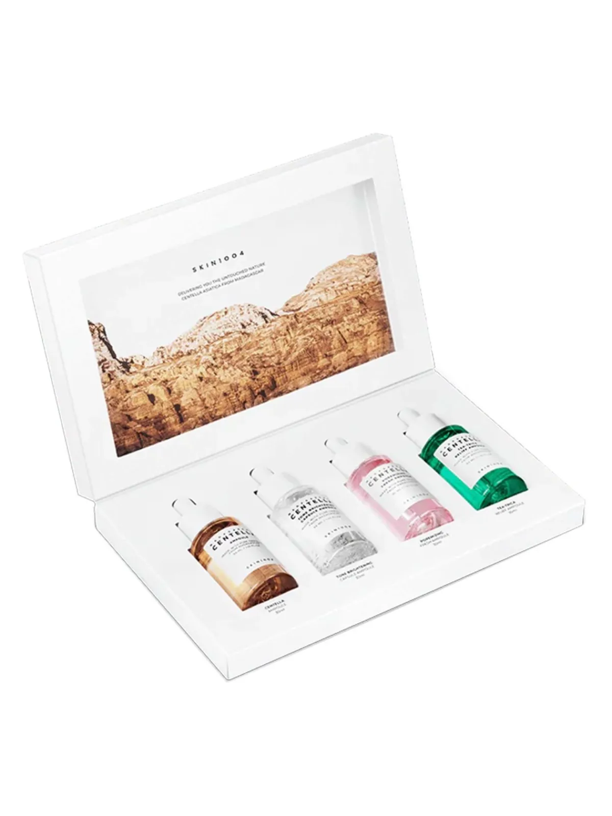 Kit de cuatro ampollas mini de SKIN1004 para una rutina completa: ayudan a calmar, iluminar, reducir granitos y minimizar poros. Ideal para descubrir tu favorita.