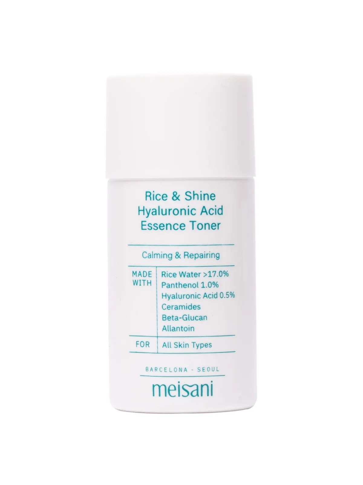 Meisani apuesta por incluir sólo los ingredientes que tu piel necesita en sus fórmulas, por eso en Rice & Shine Hyaluronic Acid Essence Toner encontramos agua de salvado de arroz, un nutritivo antioxidante muy utilizado en Asia (¡geishas incluidas!) que aporta luminosidad la piel. Además, su 1% de pantenol hace que este tónico sea ideal para esos momentos en los que notas la piel seca, sensible, incómoda o deshidratada, porque ayuda a calmar, hidratar y contribuye a que su función barrera se regenere. También cuenta con un 0.5% de ácido hialurónico, para retener la hidratación de la piel y suavizarla visiblemente; y un complejo al que llamamos ABC: Alantoína, Beta-Glucano y Ceramidas, que serán ideales para ayudar a reparar tu piel y retener la hidratación por más tiempo.