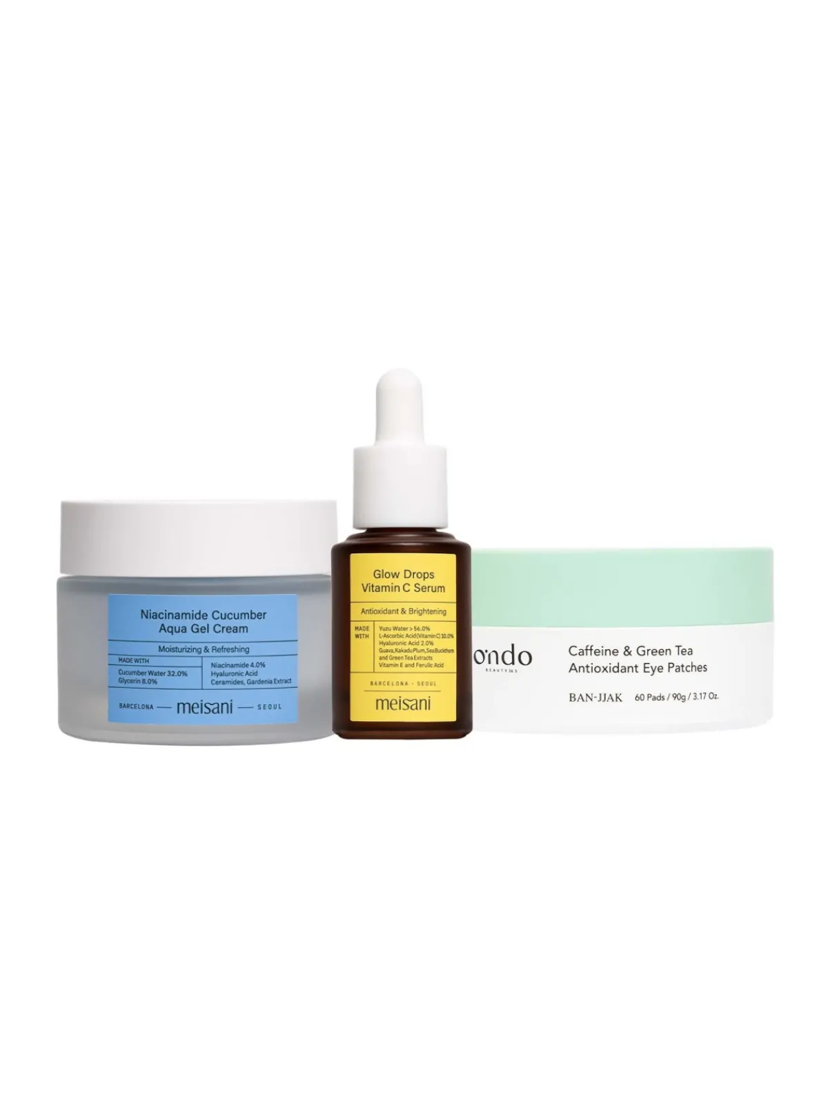 Pack para recuperar el glow después de una noche de fiesta. Incluye parches con cafeína, sérum con vitamina C y gel hidratante con pepino y niacinamida.